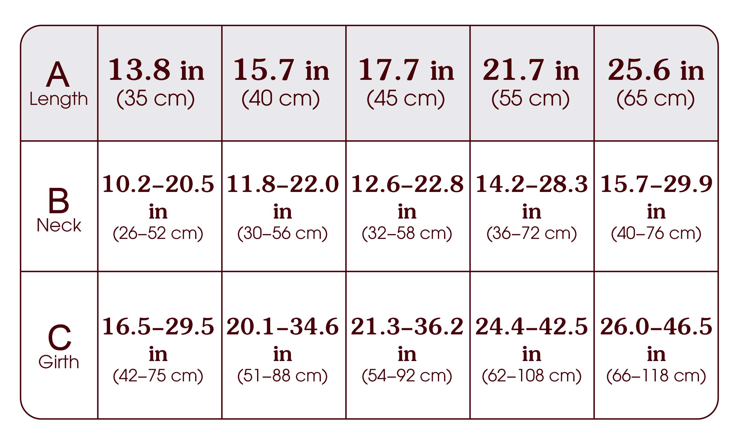 - Neck measurement indicates the girth range (cm) suitable for the coat collar. The collar is designed to be generous in order to provide large range of motion for the head. The fit will be good even if the collar girth would be 20cm larger than your pet's neck girth.